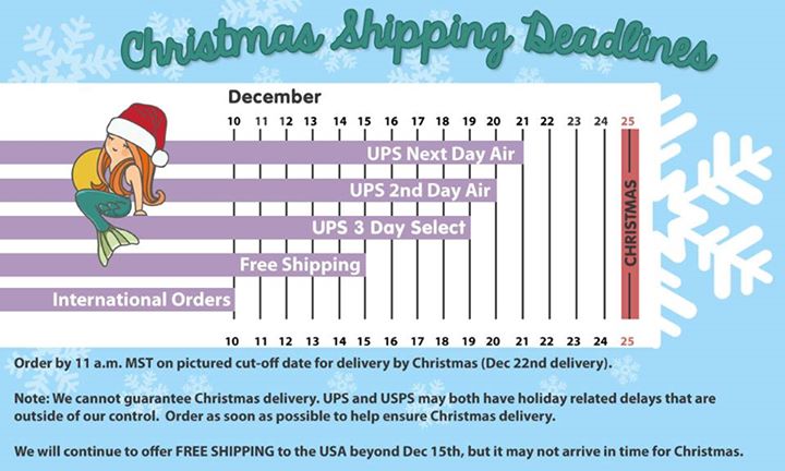 Giving gifts far and wide is a hallmark of the holiday season! To help everyone plan ahead and facilitate smooth gift-giving, we have released our Christmas Shipping Deadlines. Use this handy chart to decide how and when is the best way for you to ship your gift to loved ones. A few things to remember: You need to order by 11:00 am MST on the cut-off day for your package to make it! Christmas is on a Monday this year, which is trickier when shipping since most companies don't deliver on Saturday or Sunday. This chart plans for your package...