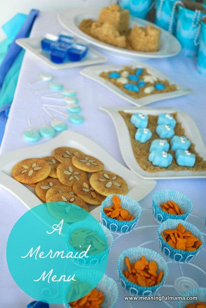 Are you throwing a birthday party or general mermaid bash for the mermaid lovers in your life? You've come to the right place! Last week we brought you some Mermaid Birthday Party ideas, but let's talk about food! There are so many different ideas out there for mermaid party food.I've compiled some of them here.Jodi at Meaningful Mama has prepared a full menu for a mermaid themed party. SourceIncluded in the menu: Crescent Roll Cheesy Fish, Starfish Marshmallows, Sand Dollar Sugar Cookies, Sand Castle Rice Krispy Treats, and much more!Click over for recipes!Childhood 101 has a whole host of ideas...