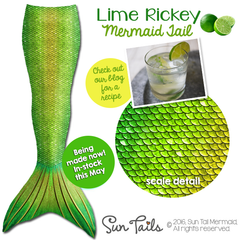 Guess what's being made right now? A new color for our realistic mermaid tail collection! It's a beautiful mix of green, lime green, and yellow hues so we've named it Lime Rickey. Lime Rickey is a fun and yummy summer drink that's easy to make. There are lots of variations, but this is our favorite:LIME RICKEY RECIPE Ingredients: Juice squeezed from 6 - 7 limes. You want about 8 ounces. 1 cup of white granulated sugar 1 cup of water 1 1/2 cups (12 ounces) seltzer (plain fizzy water) Lime wedges, for garnish Directions: In a small saucepan combine the...