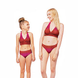 We love the sporty, cute look of our bikini pieces. The top has a wide, comfy band, and the hipster swim bottoms are comfortable and tugless!