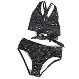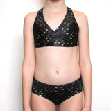 We love the sporty, cute look of our bikini pieces. The top has a wide, comfy band, and the hipster swim bottoms are comfortable and tugless!